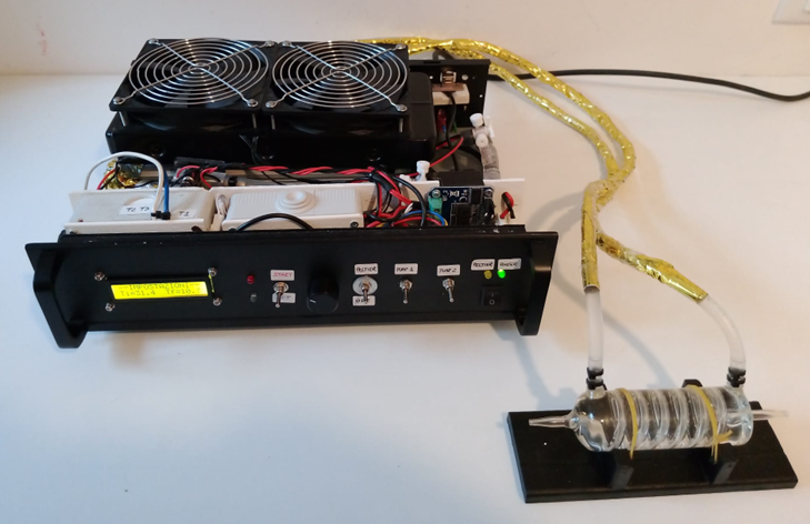 The core component of the device is the Peltier cell, which can heat one side while cooling the other, depending on the polarity of their power supply.
